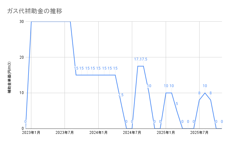 今回のガス代補助金について、まだ具体的な内容は伝わっていませんが前回、2025年夏のガス代補助金がピーク時10円/立米であったことをふまえると同程度か、それ以下の水準になることが予想されます。一般的な家庭で月のガス料金が数百円程度、押し下げられます。